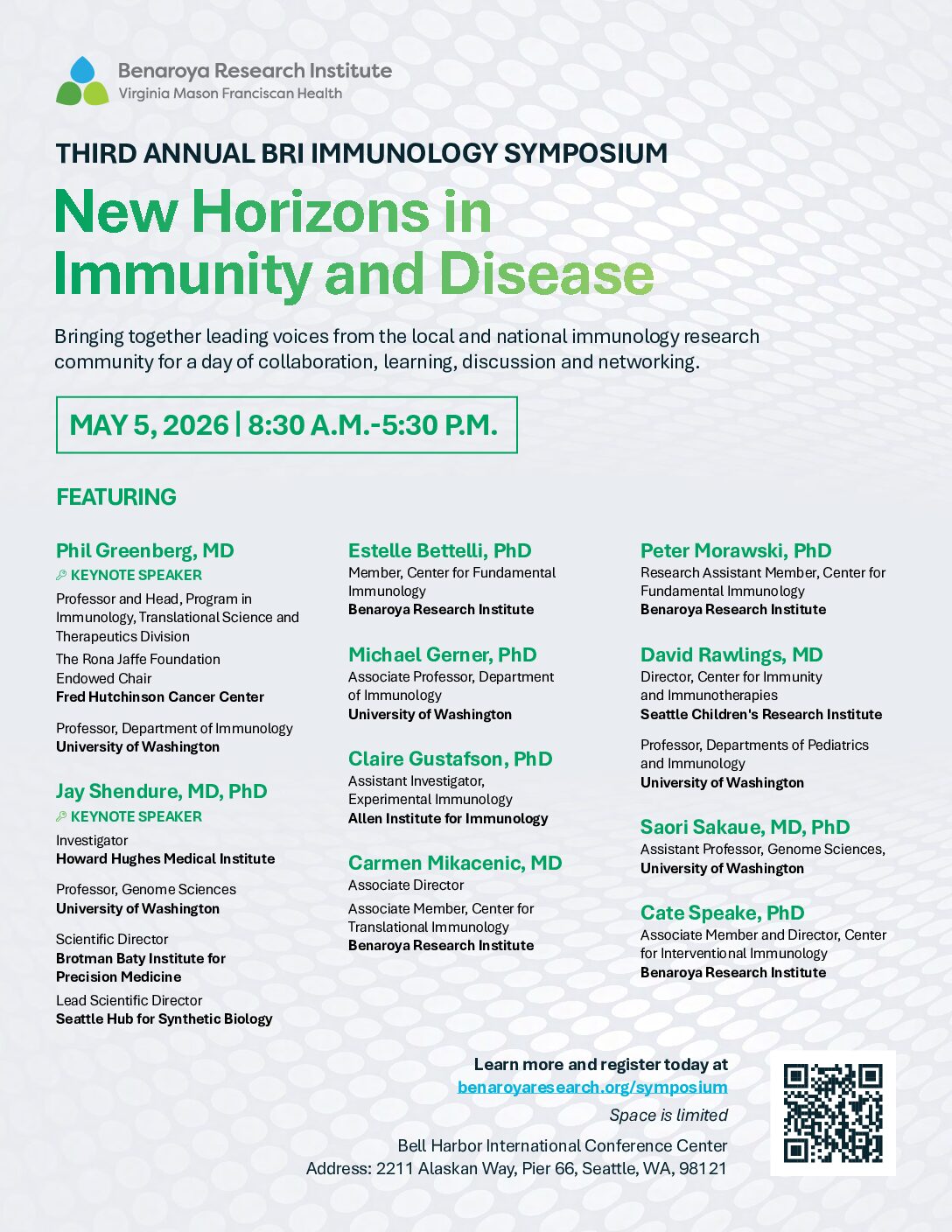 Benaroya Research Institute's third annual immunology symposium, New Horizons in Immunity and Disease, will take place on Tuesday, May 5, 2026. Due to strong interest and enthusiastic support from the immunology community,...